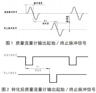 將智能型電磁流量計流量與相關(guān)測試設備連接起來,就可以進行智能型電磁流量計的校準,時間差△ t 由專用試驗測試設備可以測出。起始脈沖信號和終止脈沖信號如圖 1 所示。經(jīng)過專用試驗測試設備信號轉(zhuǎn)化后的信號方波如圖 2 所示。