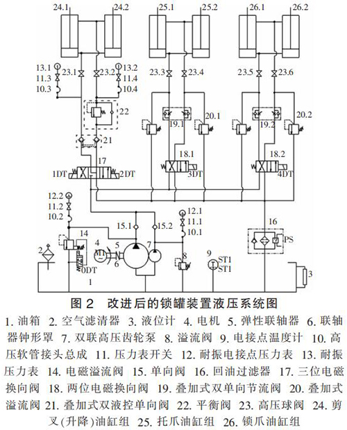 (2)由于升降油缸和托、鎖爪油缸的工況不同,所需油壓也不同,原液壓系統(tǒng)中齒輪泵統(tǒng)一供油,整個(gè)工作過(guò)程中系統(tǒng)功率消耗大,不夠節(jié)能,工作電機(jī)始終帶載運(yùn)行,不僅功率損耗大,而且易引起油溫急劇增加,對(duì)整個(gè)提升系統(tǒng)及液壓系統(tǒng)的性能和壽命造成惡劣影響;