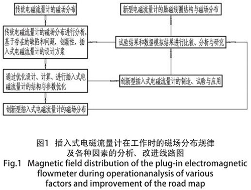 測水流量計(jì)因其特殊的結(jié)構(gòu)形式,致使其抗干擾能力較弱、準(zhǔn)確度偏低以及瞬時(shí)流量波動(dòng)過大等不良現(xiàn)象,但便于安裝、造價(jià)低廉、普遍應(yīng)用于大管道等特點(diǎn)而存在。為了發(fā)揮其優(yōu)勢,消除其不利因素,對(duì)其內(nèi)部結(jié)構(gòu)及其相關(guān)技術(shù)參數(shù)進(jìn)行優(yōu)化設(shè)計(jì),從而使其準(zhǔn)確度能夠達(dá)到 ±1% FS,使抗干擾能力得到極大地增強(qiáng)。本文主要通過優(yōu)化設(shè)計(jì)、選擇材料和試驗(yàn),使測水流量計(jì)的穩(wěn)定性和準(zhǔn)確度大幅度提高,并提出解決措施,對(duì)實(shí)際應(yīng)用具有參考價(jià)值。分析與研究程序圖如圖 1 所示。