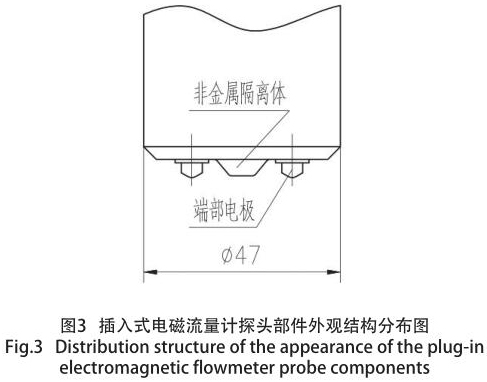 通過大量的試驗(yàn),對(duì)探頭端部外型結(jié)構(gòu)亦采用特殊設(shè)計(jì),從而消除兩個(gè)電極之間的擾流現(xiàn)象,同時(shí)亦消除因通電產(chǎn)生磁場,導(dǎo)致兩個(gè)電極吸附介質(zhì)中的鐵屑而影響測量精度和死區(qū)效應(yīng),增強(qiáng)了輸出信號(hào)的穩(wěn)定性,從而提高傳感器準(zhǔn)確度和抗干擾性。通過結(jié)構(gòu)的優(yōu)化設(shè)計(jì),使用壽命更長,測水流量計(jì)探頭局部,如圖 3 所示。