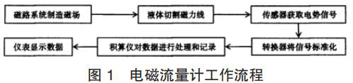智能渦輪流量計的產(chǎn)生主要是基于法拉*電磁感應定律。在智能渦輪流量計的應用中,磁路系統(tǒng)會在流量計運行過程中逐步出現(xiàn)直流磁場與交流磁場,該磁場的產(chǎn)生為后期的測量提供了良好的前提條件,營造了測量所需的磁場環(huán)境,因此,在智能渦輪流量計應用時,一旦被測液體在導管中經(jīng)過該磁場環(huán)境時,必然會產(chǎn)生一定的切割磁力線運動,在這種情況下,電極傳感器就會發(fā)揮其作用,將導管內(nèi)的流量轉(zhuǎn)換為感應電勢信號,隨后此轉(zhuǎn)換形成的信號逐步被傳遞給轉(zhuǎn)換器。而轉(zhuǎn)換器更是可以將所獲得的流量信號等加以處理,通過分析、對比等,轉(zhuǎn)換器會將該信號變?yōu)闃藴市盘枺S后將該信號輸出給積算儀,進一步進行信號的處理,這些處理以后的信號*終會在智能渦輪流量計的儀表中顯示,呈現(xiàn)*終的流量測量結(jié)果,其基本的流程如圖 1 所示。