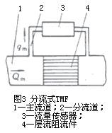 為了獲得良好的線形輸出,必須保持層流流動(dòng),測量管內(nèi)徑d設(shè)計(jì)得很小而長度l很長,即有很大l/d比值,流速低,流量小。為擴(kuò)大儀表流量,還可采用在管道內(nèi)裝管束等層流阻流件;擴(kuò)大更大流量和口徑還常采用分流方式,在主管道內(nèi)裝層流阻流件(見圖3)以恒定比值分流部分流體到流量傳感部件。有些型號(hào)儀表也有用文丘里噴嘴等代替層流阻流件。
