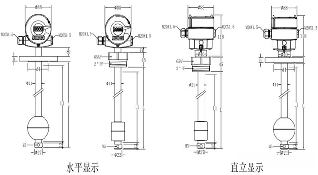為更直觀地給用戶展現(xiàn)遠傳浮球液位計的規(guī)格,請參考兩種遠傳浮球液位計水平顯示以及直立顯示的不同規(guī)格尺寸,如下圖所示: