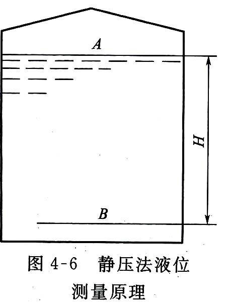 由式(4—8)和式(4—9)可知,液體任何一點的壓力等于其表面壓力加上液體密度與重力加速度及液柱高度的乘積。液體的靜壓力是液位高度和液體密度的函數(shù),當液體的密度為常數(shù)時,A、B圖4—6靜壓法液位測量原理兩點的壓力或壓差僅與液位高度有關。因此可以通過測量P或Ap來實現(xiàn)液位高度的測量。這樣液位高度的測量就變?yōu)橐后w的靜壓測量,凡是能夠測量壓力或壓差的儀表,只要量程合適均可用于液位測量。