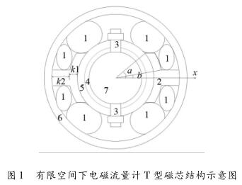 T型磁芯是為較小的空間下實(shí)現(xiàn)盡可能大的勵(lì)磁線圈而提出的,如圖1所示為較小空間結(jié)構(gòu)下,設(shè)計(jì)有T型磁芯的井水流量計(jì)傳感器截面圖。在圖中1表示線圈位置;2表示磁芯位置;3表示電極及其固定器件位置;4表示襯里位置;5表示內(nèi)徑壁位置;6表示外徑壁;7表示測(cè)量管道(測(cè)量區(qū)域)。如圖1所示井水流量計(jì)勵(lì)磁結(jié)構(gòu)磁芯造型近似為T型(因稱為T型磁芯),磁芯在靠近井水流量計(jì)內(nèi)管道時(shí)為T型磁芯的較長(zhǎng)端。如圖中所示,T型磁芯較長(zhǎng)端與x軸夾角為a,T型磁芯較短端與x軸夾角為b,T型磁芯較長(zhǎng)端寬度為k1,T型磁芯較短端寬度為k2。
