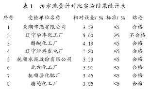 根據(jù)化工污水流量計(jì)選型的校驗(yàn)標(biāo)準(zhǔn),撫順市安裝的化工污水流量計(jì)選型運(yùn)行比較正??勺鰧?duì)比試驗(yàn)的有14臺(tái),對(duì)這14臺(tái)流量計(jì)分別進(jìn)行了對(duì)比試驗(yàn)。測(cè)試方法是采用標(biāo)準(zhǔn)儀器對(duì)所監(jiān)測(cè)的流量計(jì)進(jìn)行8h的連續(xù)平行監(jiān)測(cè),從試驗(yàn)結(jié)果中選出被檢流量計(jì)*大流量范圍的五點(diǎn)對(duì)比數(shù)據(jù)和累計(jì)流量對(duì)比結(jié)果,相對(duì)誤差小于5%的為合格。此次實(shí)際測(cè)試的有:撫順縣化肥廠、北方化工廠、撫順?biāo)喙煞萦邢薰尽⑦|寧能港發(fā)電廠、醇醚化工廠、遼寧華豐化工廠、天湖啤酒有限公司、腈綸化工廠8家企業(yè)。飛利鋁材、汽車鋁輪轂、老虎臺(tái)礦、石油一廠新廠因?yàn)闊o(wú)水未測(cè)試,石油二廠新排污口、乙烯化工廠因?yàn)槿鄙倭髁坑?jì)廠方配合未能測(cè)試。測(cè)試結(jié)果除華豐化工廠流量計(jì)相對(duì)誤差大于5%不合格外,其他均合格,見表1。