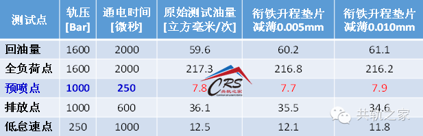 由彈道區域進入非彈道區域的拐點沒有變化,但是非彈道區域的油量曲線與原始曲線(藍色曲線)呈放射狀分布,即通電時間越長,噴油量增加得越大。這時候,如果只是一味無限制地通過加厚針閥升程墊片的方法來降低全負荷點的油量,就會顯著地改變噴油器的動態噴射特性,如綠色曲線所示。高速區內,只有在全負荷一個噴射點的油量與記錄在ECU內部的標準油量曲線一致,通電時間較短時,油量偏小,而通電時間較長時,油量偏大。這就是為什么明明所有噴射點油量都符合規范,但卻敲缸的原因。事實上,如果車子經常超載,不光會敲缸,油耗還會偏高。當全負荷點偏大較多時,不要試圖通過加厚針閥升程墊片的方式來降低油量,需要直接更換新油嘴。通常,對于針閥升程為300微米的噴油器,調整幅度不要超過80微米。而對升程為200微米的噴油器,調整幅度不要超過50微米。小軌提醒2為什么按照共軌之家提供的方法,預噴點調不下來?很多泵友遇到這種情況:維修后的噴油器上試驗臺測試,回油量、全負荷點、排放點、低怠速點的油量都符合規范,唯獨預噴點的油量偏大不少。依據共軌之家“信息工具-墊片調整指南”里的指導,其他正常,預噴點偏大時,減薄銜鐵升程墊片,以0.005mm為間隔下調。如下所示(噴油器0445120078):