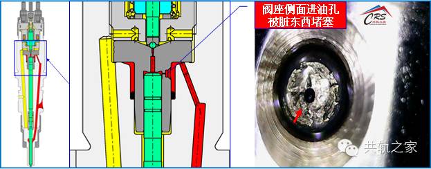 1)閥座進油口堵有顆粒,閥桿端和油嘴端油壓嚴重失衡,閥桿無法落座,導致噴油器常噴,進而軌壓上不去。